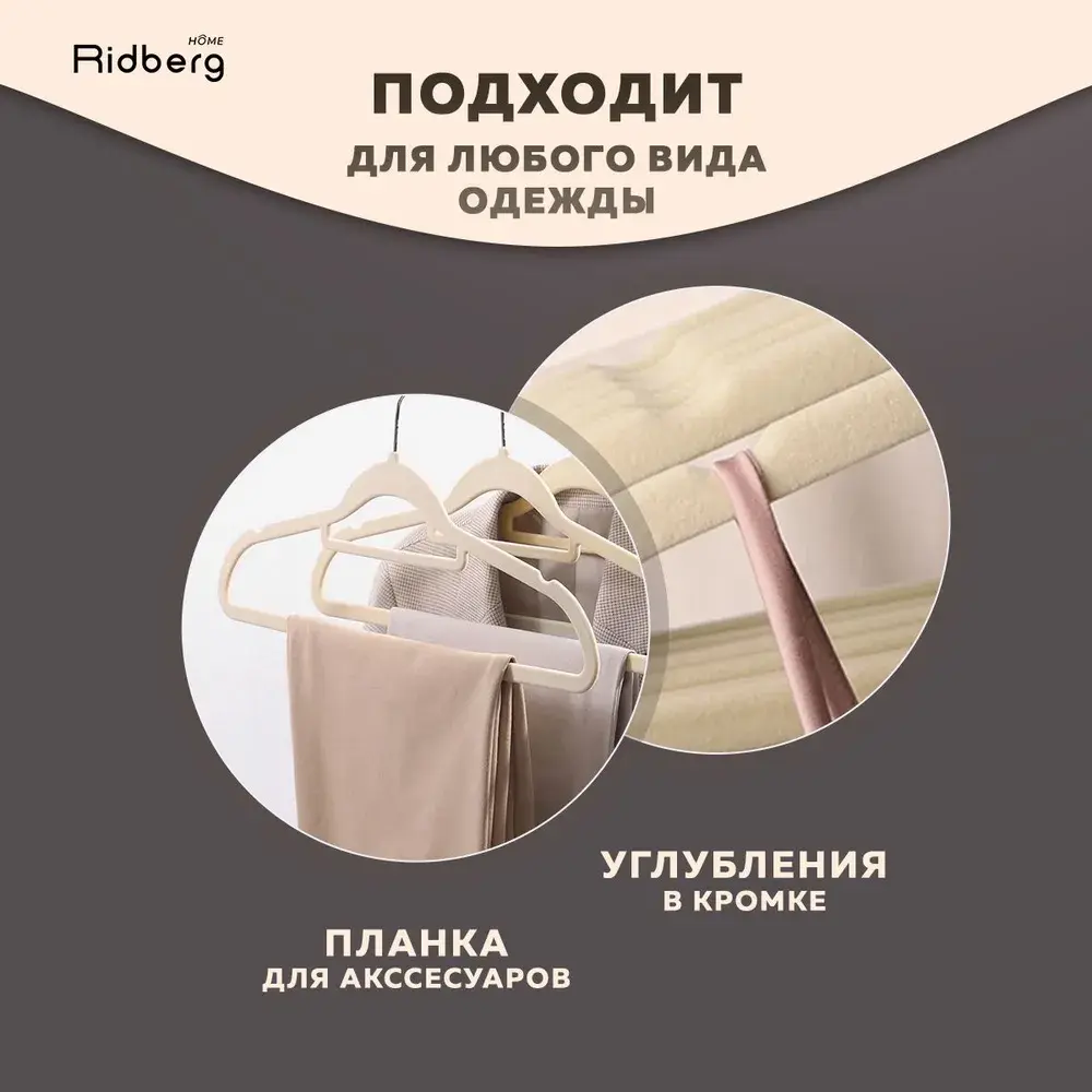 Вешалка-плечики для одежды Ridberg подходят для хранения верхней и повседневной одежды. Надежная основа покрыта бархатным нескользящим напылением, поэтому плечики подходят для хранения изделий из тонких благородных тканей. Специальные выемки на плечиках не дают проскальзывать даже одежде на тонких бретелях.